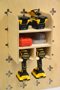 - Praktisch: Der Halter ist für 2 Bohrmaschinen vorbereitet und verfügt über praktische Fächer für Bohrer und Ladestationen.