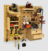 - Werkstattwand in der Größe 120x50 cm mit 36 Öffnungen zur Anbringung von Zubehör.